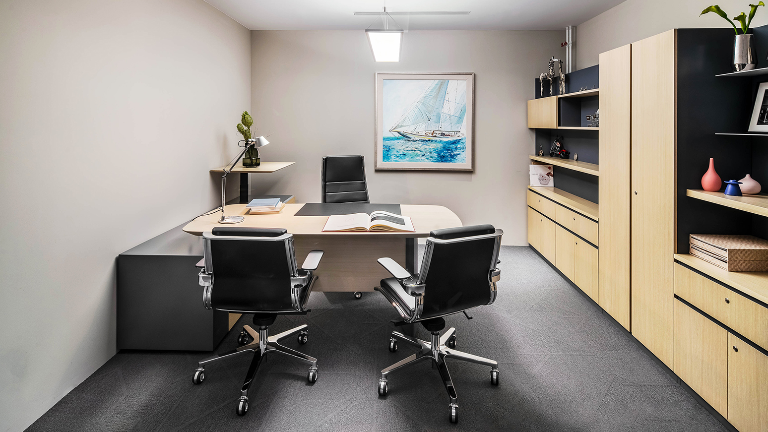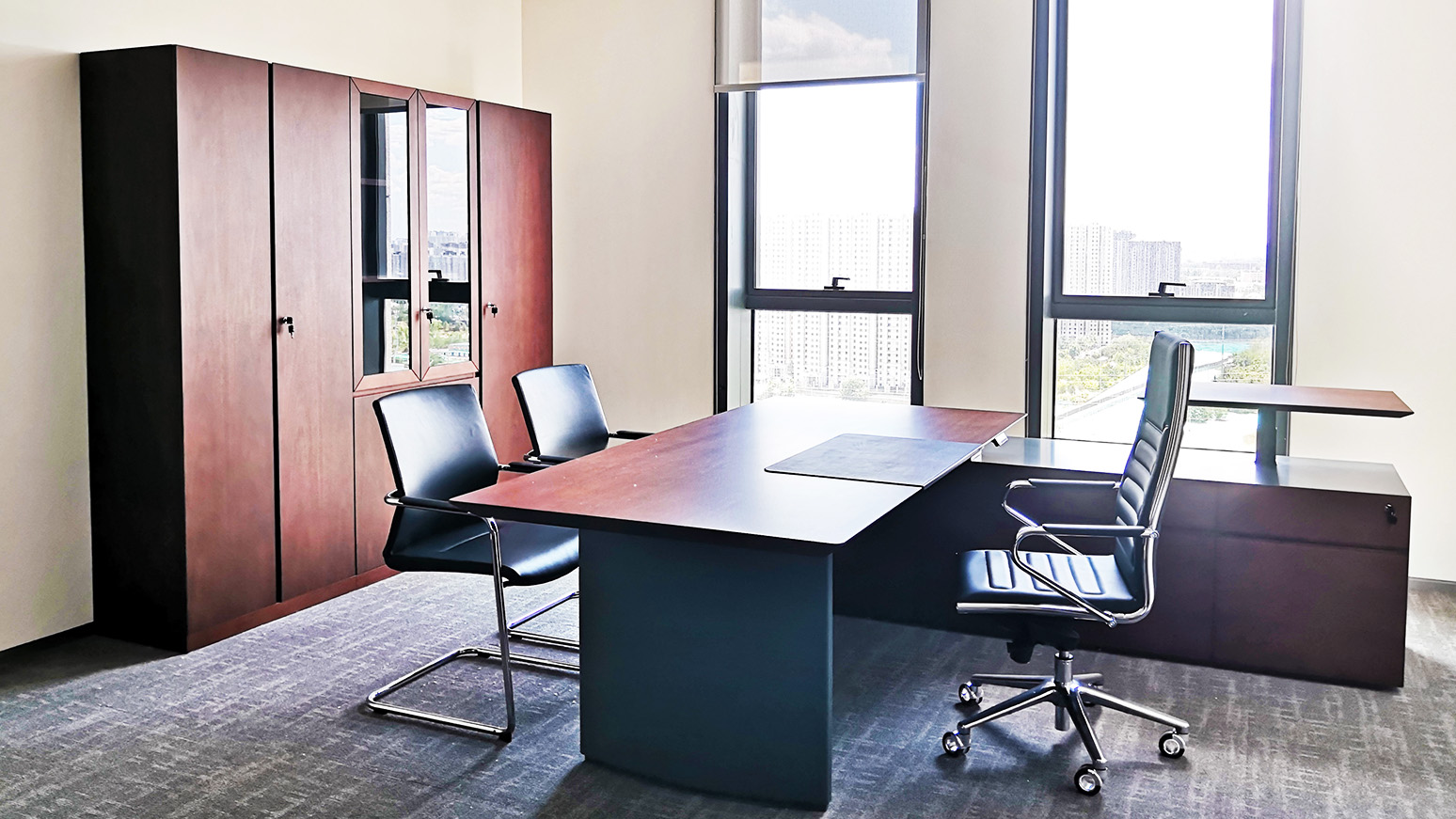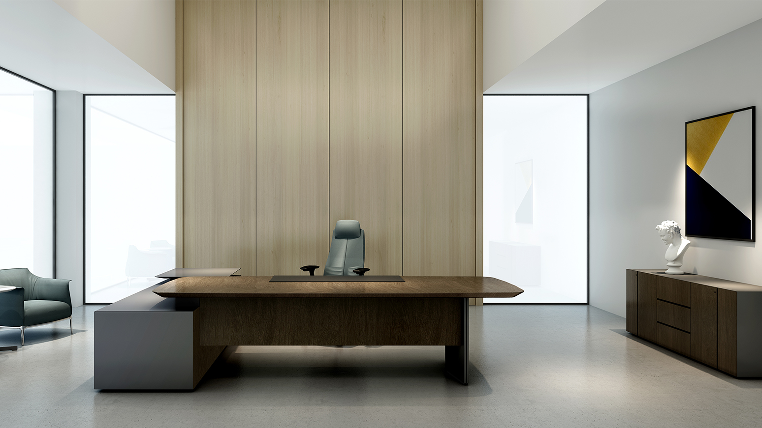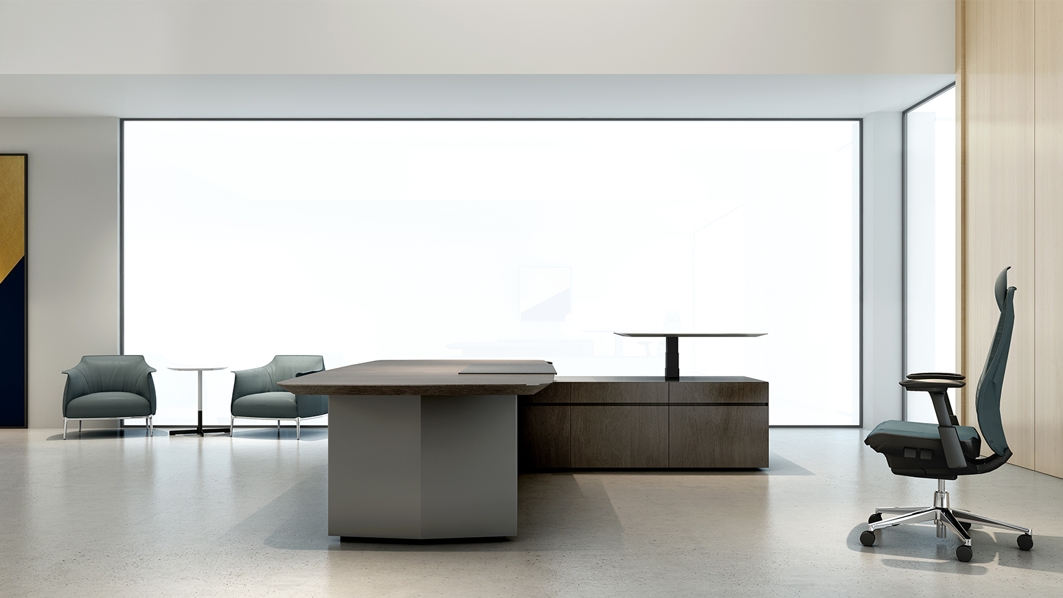 摒弃繁杂与重复,造型简练、立体又不失功能性的 arise 系列行政办公桌,为新一代企业带来“简约”的设计理念,沉稳色调,搭配自然纹理气质不言而喻。全环保材质的桌面及柜体,采用双色设计,台面边缘独特的 45 度斜切造型,简约而不失庄重。轻薄、现代的表现手法,结合进口五金铰链及抽底滑轨,隐藏式的安装部件,营造好、 优雅的行政办公氛围。